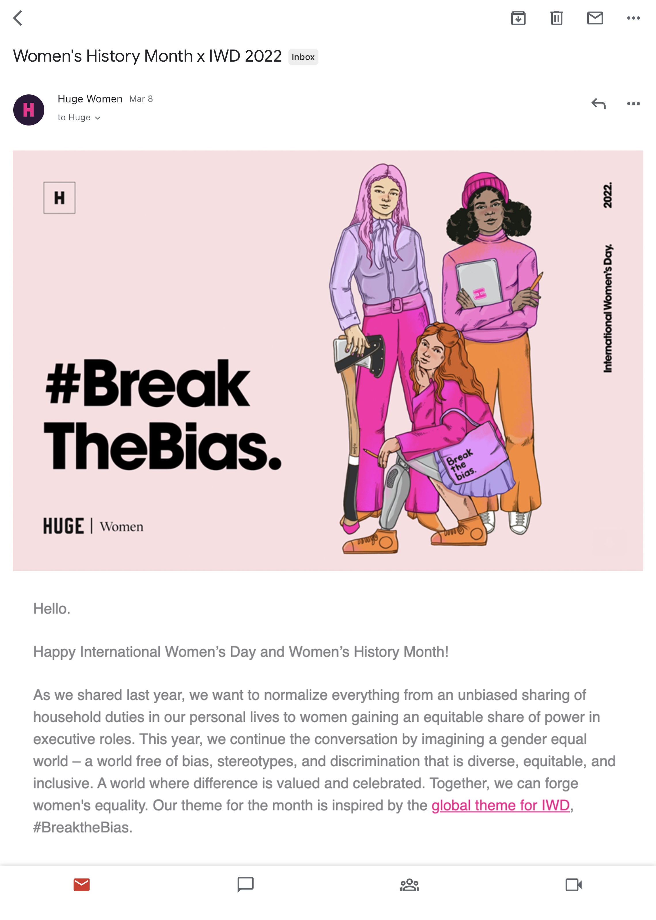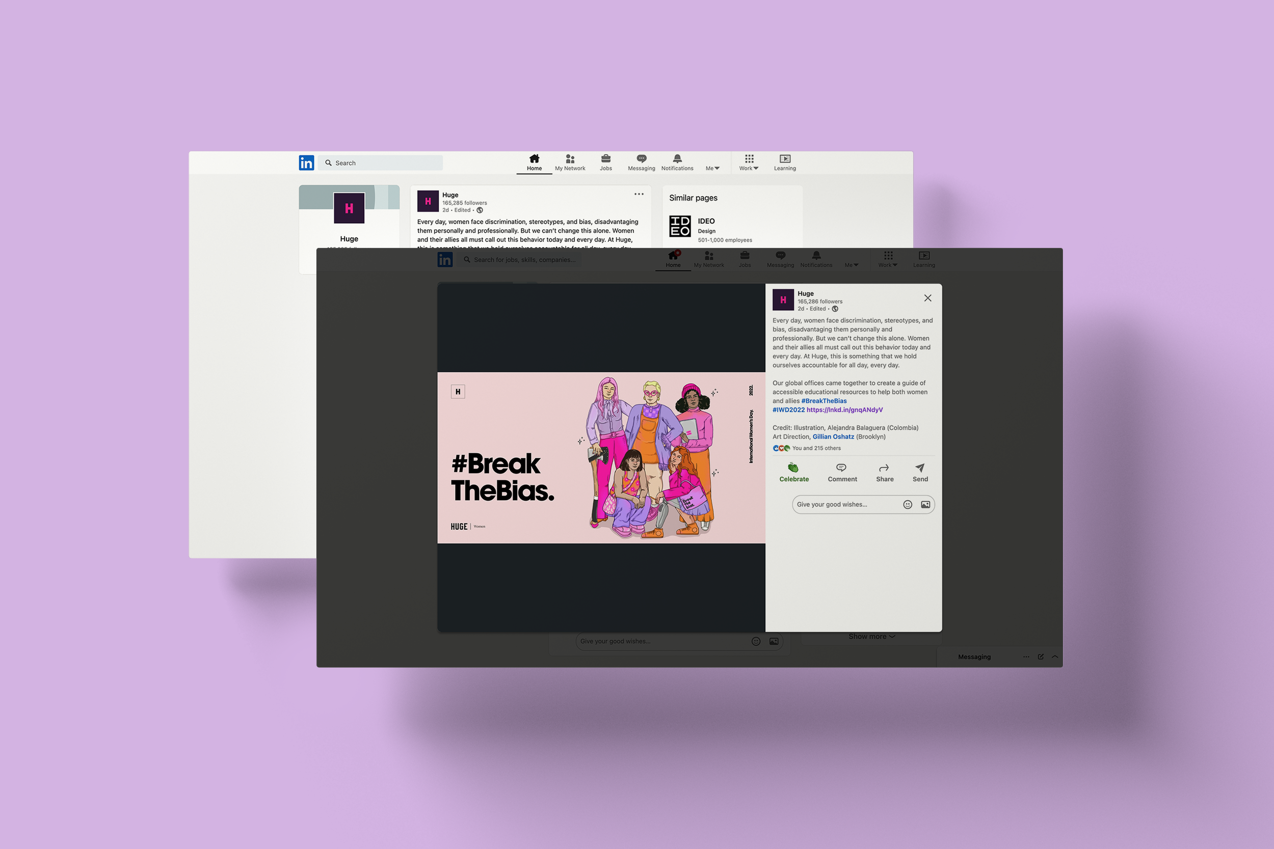 A global, company-wide newsletter was also shared, describing this year’s theme and encouraging all employees to engage in #BreakTheBias conversations through articles and publications, Huge-hosted online events and panels, and social media engagement.